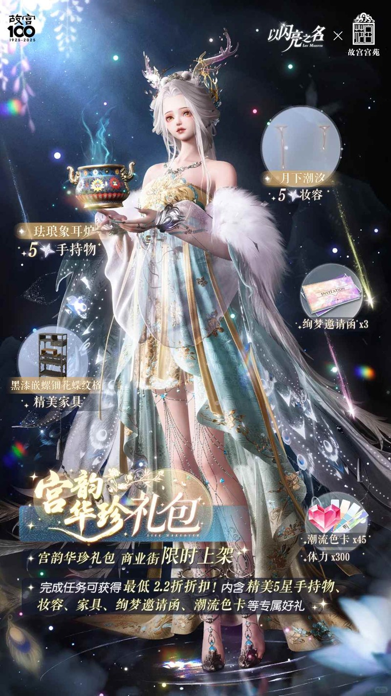 以闪亮之名x故宫宫苑联动,珐琅生辉宫韵华珍限定联动礼包开启!将千年风雪,凝于指尖一抹珐琅色;于朱墙深处,收藏盛世风华。8月1日-8月14日,宫韵华珍礼包限时特别开启!五星限定联动手持【珐琅象耳炉】带有专属主界面互动动作,在主界面穿戴并点击该手持即可触发~合伙人们快来体验全新专属互动吧!