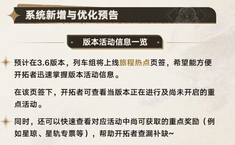 预计在3.6版本,列车组将上线旅程热点页签,希望能方便开拓者迅速掌握版本活动信息。在该页签下,开拓者可查看当版本正在进行及尚未开启的重点活动。同时,还可以快速查看对应活动中尚可获取的重点奖励(例如星琼、星轨专票等),帮助开拓者查漏补缺。