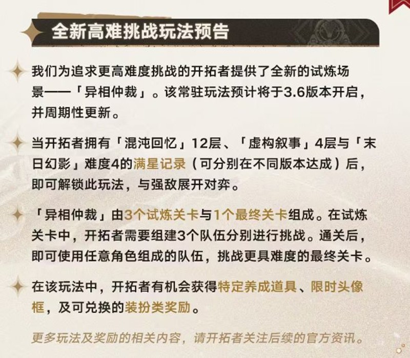 为追求更高难度挑战的开拓者提供了全新的试炼场景——「异相仲裁」。该常驻玩法预计将于3.6版本开启,并周期性更新。当开拓者拥有「混沌回忆」12层、「虚构叙事」4层与「末日幻影」难度4的满星记录(可分别在不同版本达成)后,即可解锁此玩法,与强敌展开对弈。