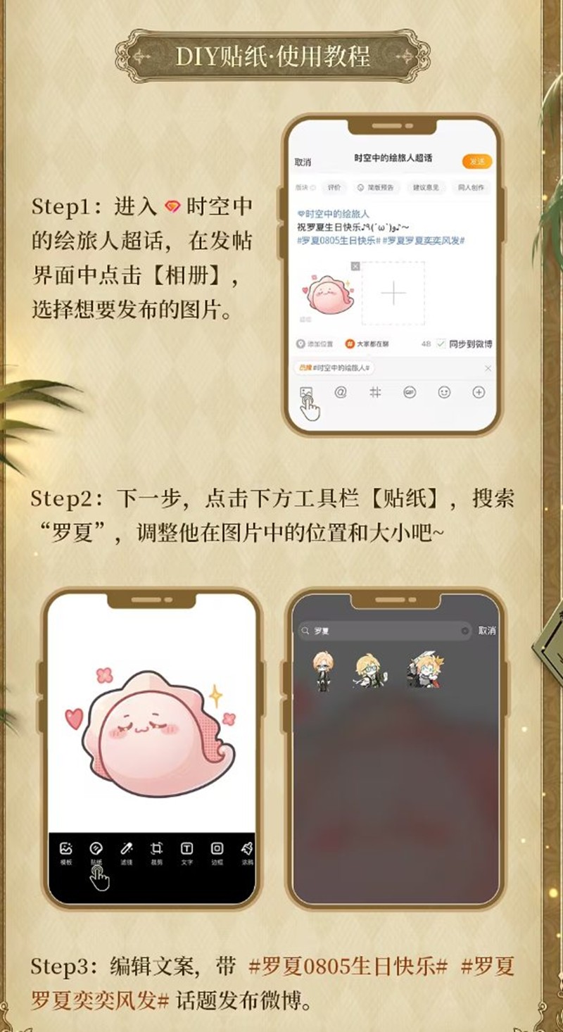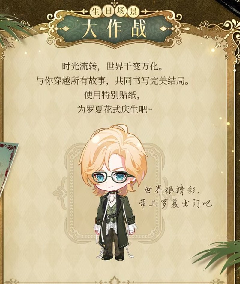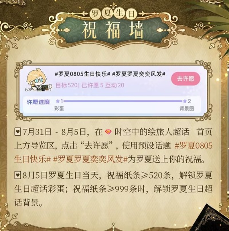 在8月5日罗夏生日当天,玩家们可以通过发送祝福纸条参与活动。当祝福纸条达到520条时,将解锁罗夏生日超话彩蛋;当祝福纸条达到999条时,将解锁罗夏生日超话背景。