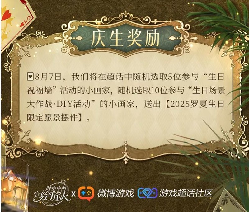 为了鼓励玩家们积极参与,活动还设置了丰富的奖励。8月7日,官方将在超话中随机选取5位参与“生日祝福墙”活动的小画家,随机选取10位参与“生日场景大作战·DIY活动”的小画家,送出【2025罗夏生日限定愿景摆件】。