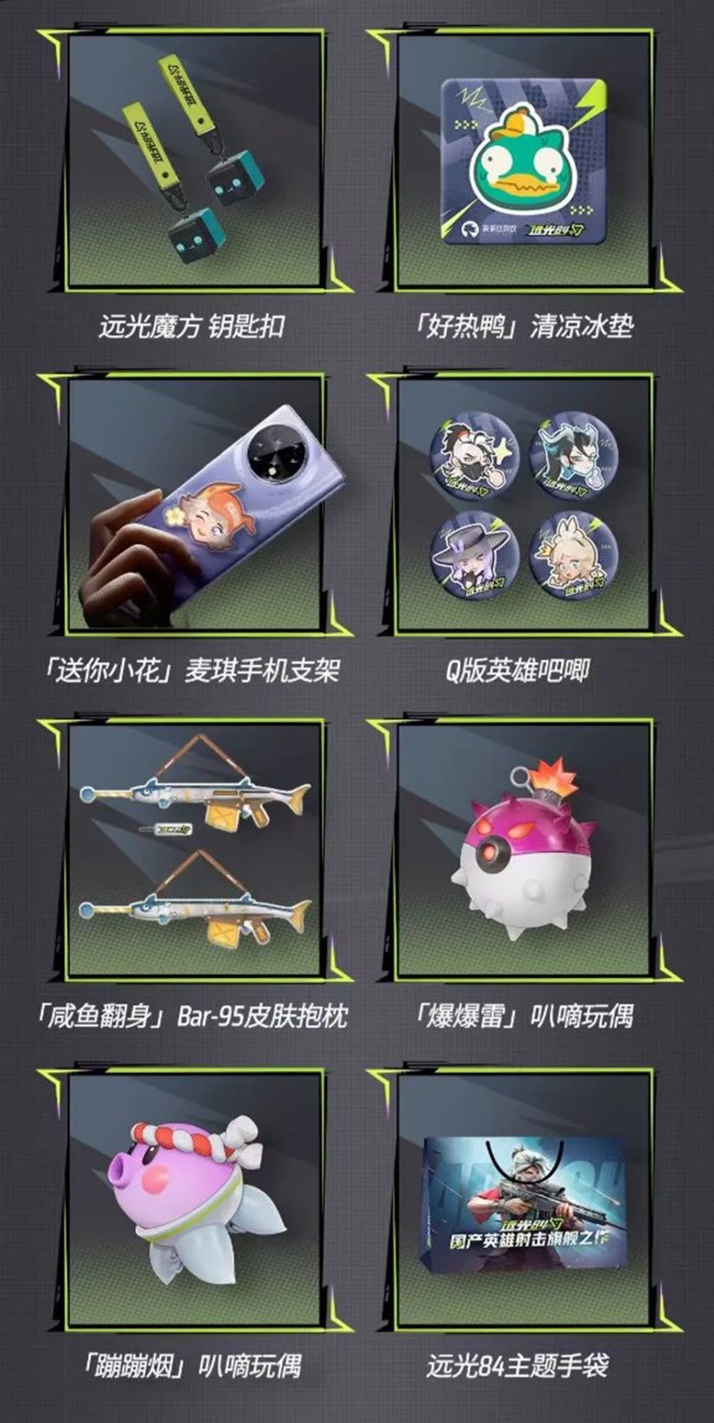 玩家可以通过参与活动获得各种精美周边,如远光魔方钥匙扣、好热鸭清凉冰垫、送你小花麦琪手机支架、Q版英雄吧唧、咸鱼翻身Bar-95皮肤抱枕、爆爆雷叭唧玩偶、蹦蹦烟叭唧玩偶和远光84主题手袋等。
