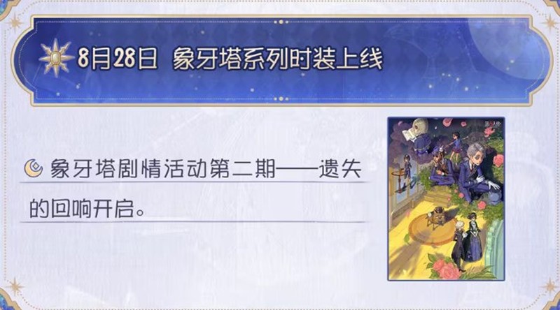 8月28日,象牙塔系列时装也将上线。象牙塔剧情活动第二期——遗失的回响开启,为玩家带来更多的故事和挑战。