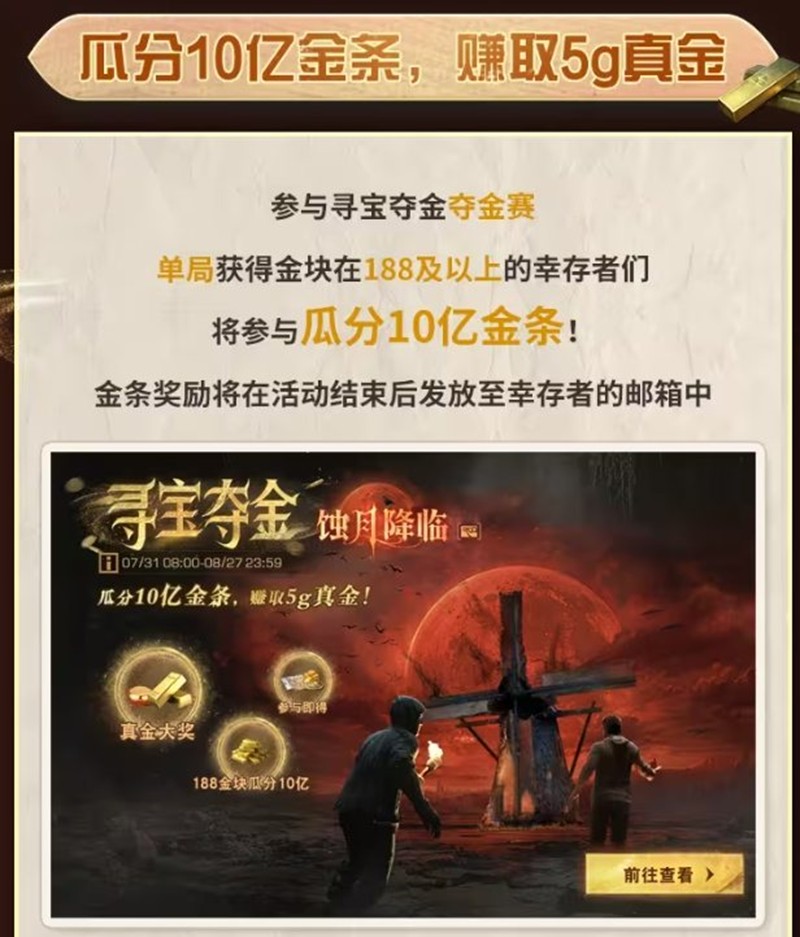 在活动期间,玩家们可以通过参与夺金赛,获得金条奖励。根据单局最高得分进行排名,前10名的幸存者将获得真金奖励。具体奖励如下: