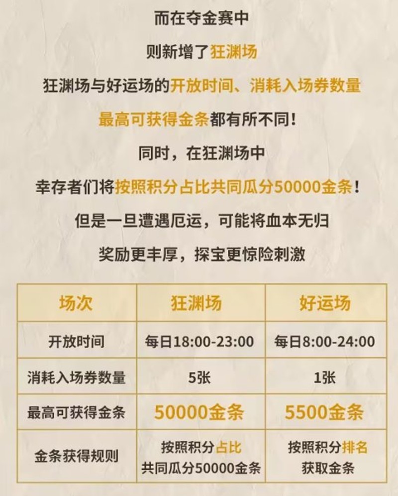 狂澜场是本次活动新增的场次,开放时间为每日18:00-23:00,消耗5张入场券,最高可获得50000金条。在狂澜场中,幸存者们将按照积分占比共同瓜分50000金条。但是,一旦遭遇厄运,可能将血本无归,奖励更丰厚,探宝更惊险刺激。