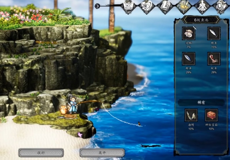 另一种获取方法是通过与蟹岛的钓叟多次互动。每次交流都会获得关于钓竿升级的信息,最终会得到制作鲲骨钓竿的线索。玩家还可以在特定鱼点钓鱼,有几率从鱼腹中获得宝箱钥匙,用钥匙开启左下区域的上锁宝箱也可能获得鲲骨钓竿。