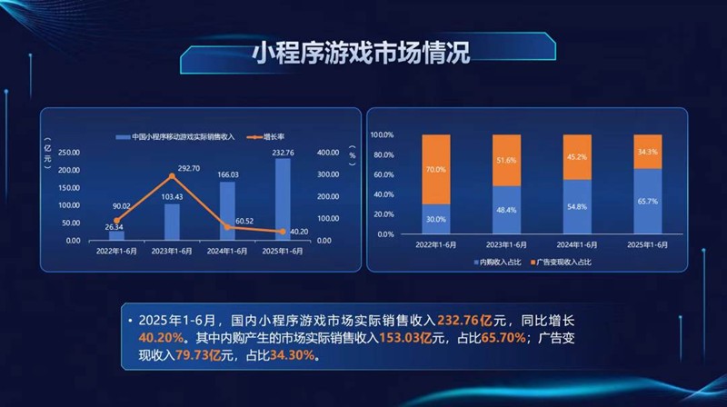 国内小程序游戏市场实际销售收入232.76亿元,同比增长40.20%。其中内购产生的市场实际销售收入153.03亿元,占比65.70%;广告变现收入79.73亿元,占比34.30%。