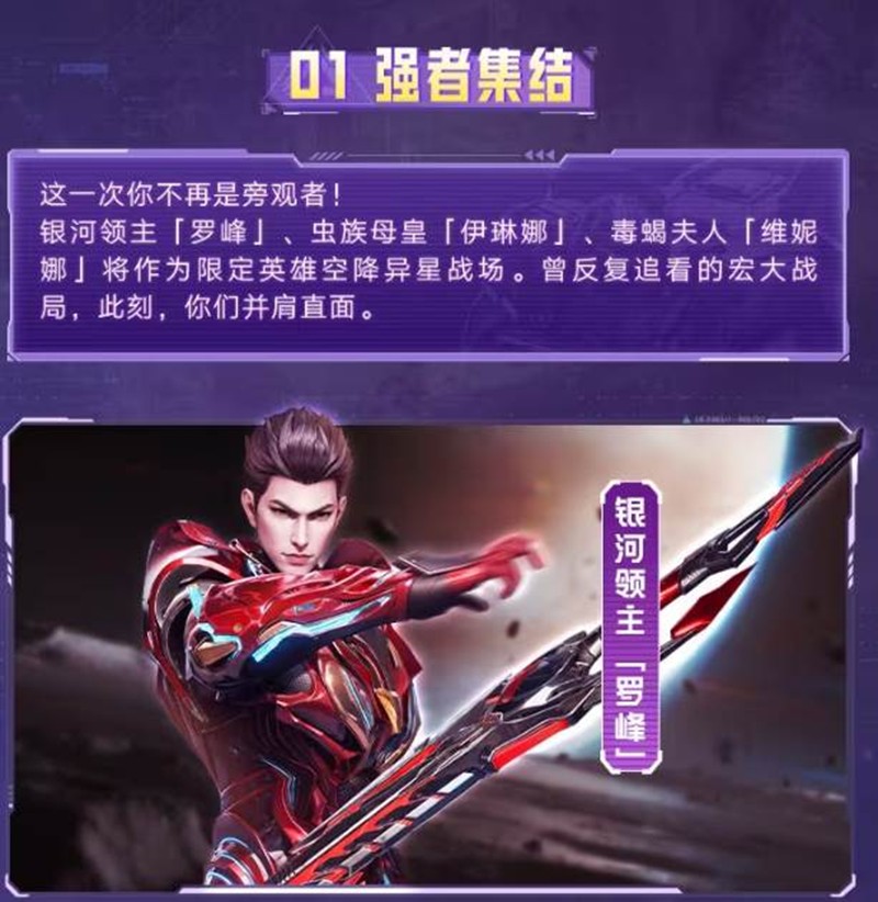 在本次联动活动中,银河领主「罗峰」、虫族母皇「伊琳娜」、毒蝎夫人「维妮娜」将作为限定英雄空降异星战场。这些角色不仅拥有独特的技能和外观,还将为玩家带来全新的游戏体验。玩家将有机会与这些强大的角色并肩作战,共同面对异星战场上的挑战。