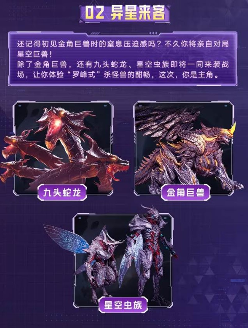 除了强大的英雄角色外,异星战场上还将出现新的敌人。金角巨兽、九头蛇龙和星空虫族等异星巨兽将加入战斗,为玩家带来全新的挑战。玩家需要运用策略和技巧,才能在这场“罗峰式”杀怪兽的战斗中取得胜利。