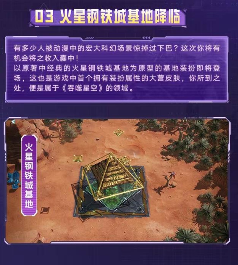 《吞噬星空》中的火星钢铁城基地将以游戏内首个拥有装扮属性的大营皮肤的形式登场。玩家将有机会将这个宏大的科幻场景收入囊中,体验《吞噬星空》的独特魅力。