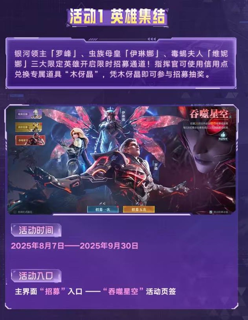 活动1:英雄集结时间:2025年8月7日—2025年9月30日入口:主界面“招募”入口——“吞噬星空”活动页签