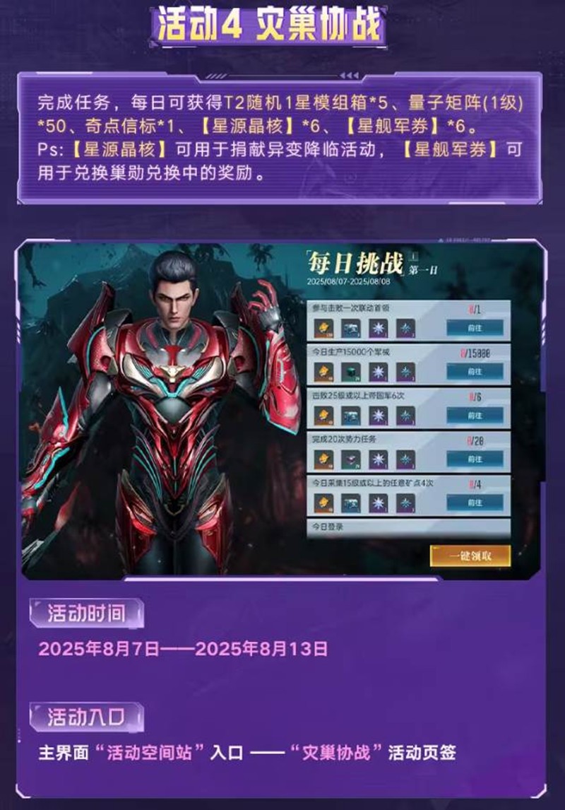 活动4:灾巢协战时间:2025年8月7日—2025年8月13日入口:主界面“活动空间站”入口——“灾巢协战”活动页签