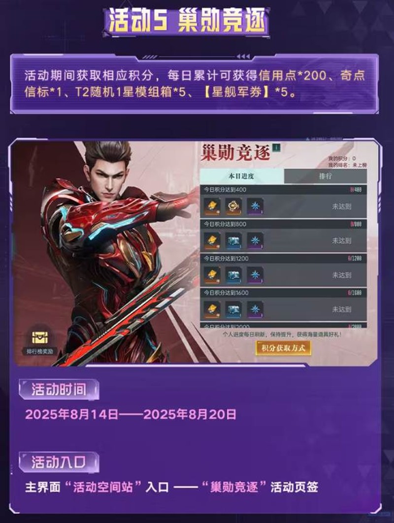 活动5:巢勋竞逐时间:2025年8月14日—2025年8月20日入口:主界面“活动空间站”入口——“巢勋竞逐”活动页签