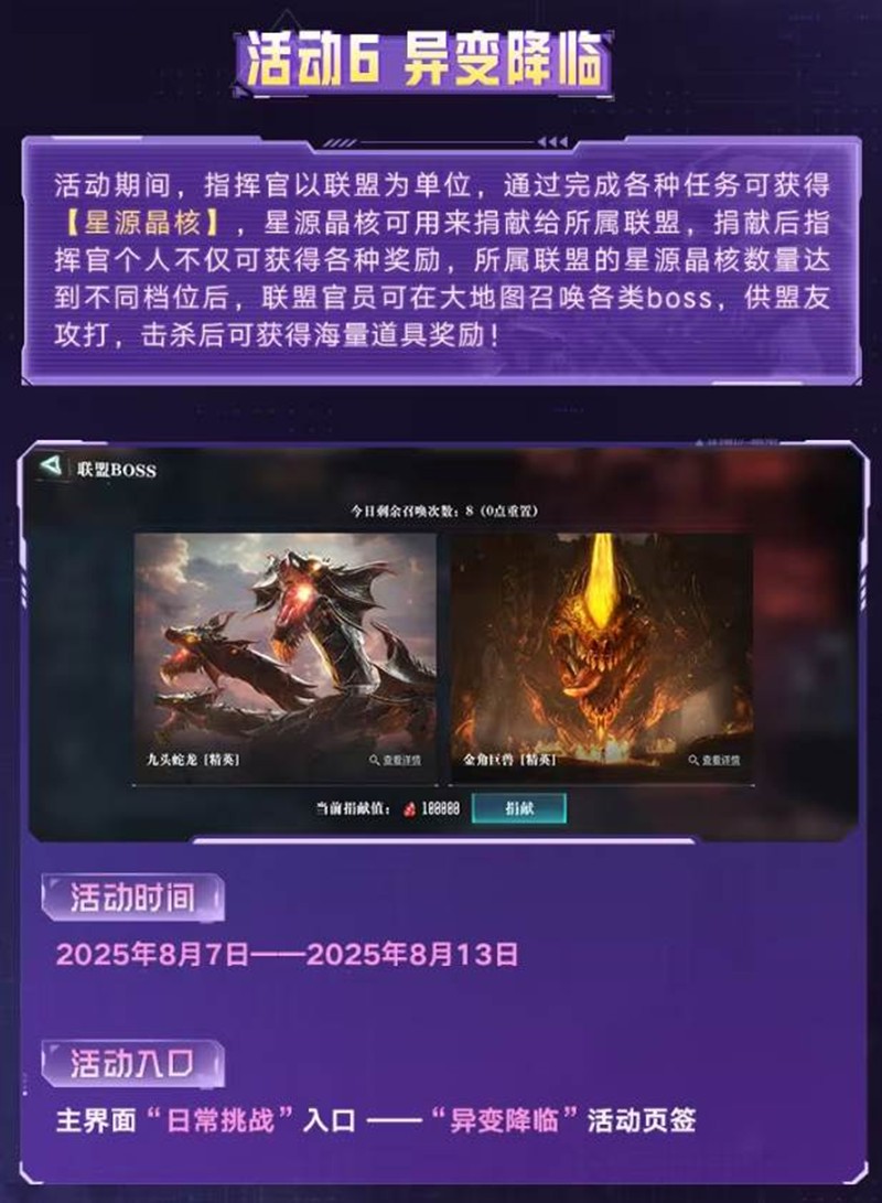 活动6:异变降临时间:2025年8月7日—2025年8月13日入口:主界面“日常挑战”入口——“异变降临”活动页签