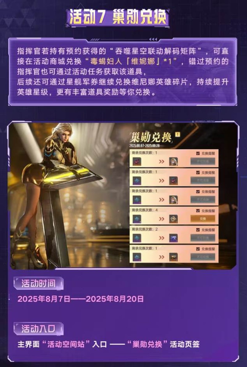 活动7:巢勋兑换时间:2025年8月7日—2025年8月20日入口:主界面“活动空间站”入口——“巢勋兑换”活动页签