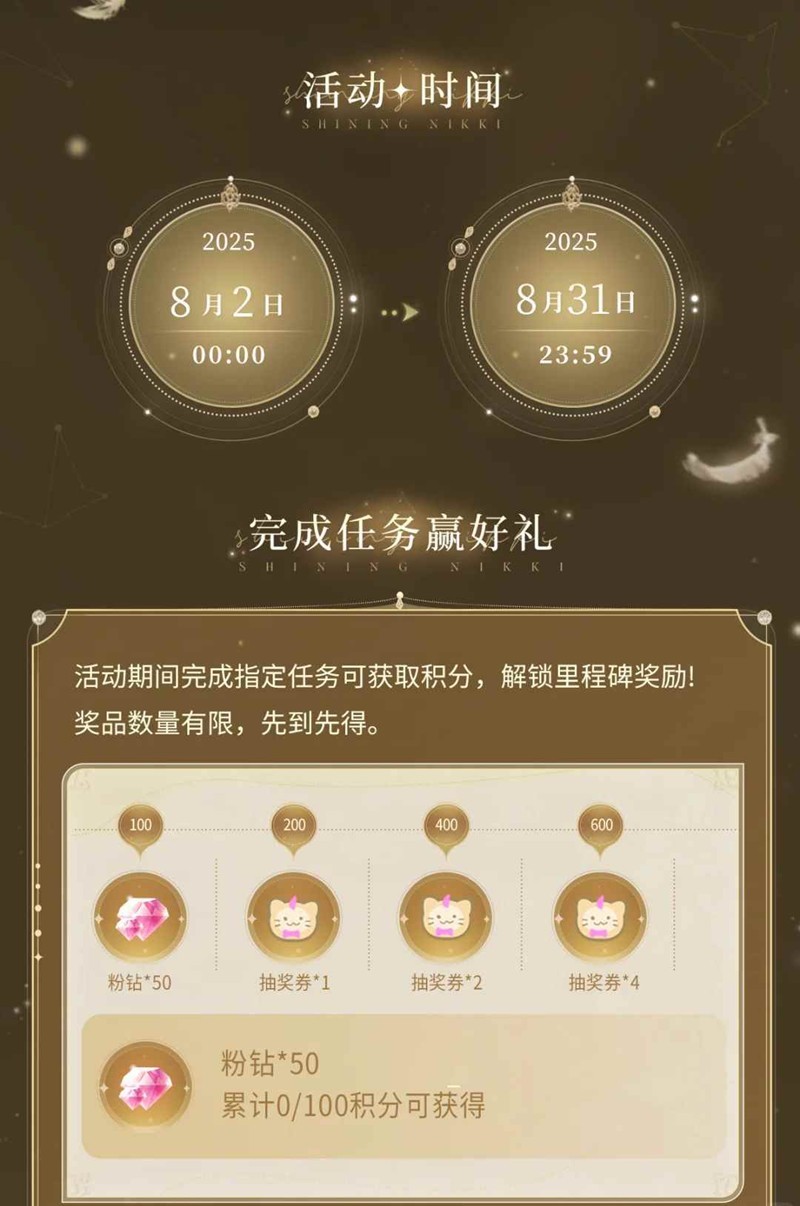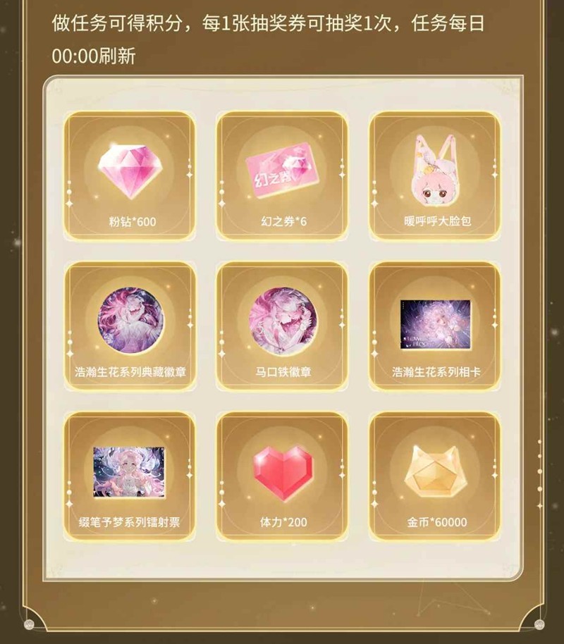完成里程碑任务,即可兑换粉钻*50&抽奖次数,抽取粉钻、暖呼呼大脸包、浩瀚生花系列周边等!