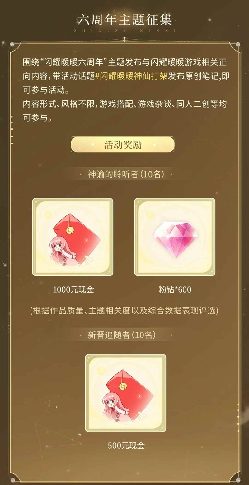 带 #闪耀暖暖 #闪耀暖暖神仙打架 ,发布与”六周年”主题相符的相关笔记,即有机会参与评奖。