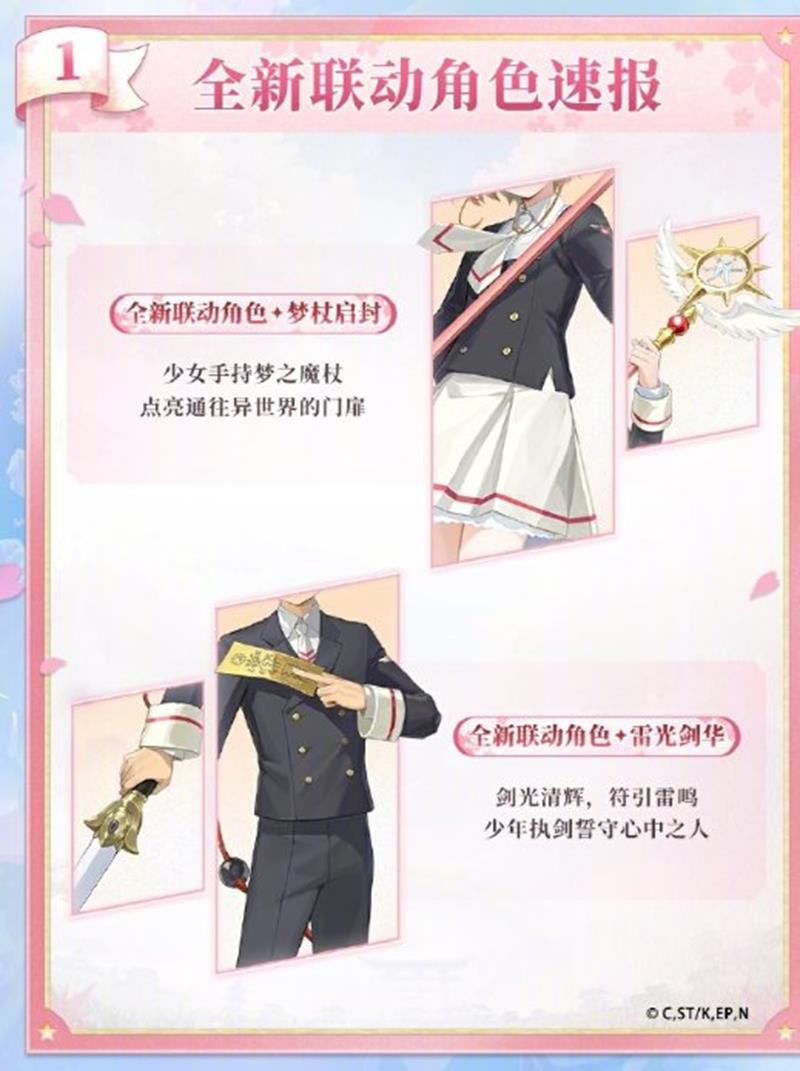 全新联动限定SSR「木之本樱」手持梦之杖,身着经典粉色战服,技能特效将透明牌的“封印”与“解放”机制完美复刻。