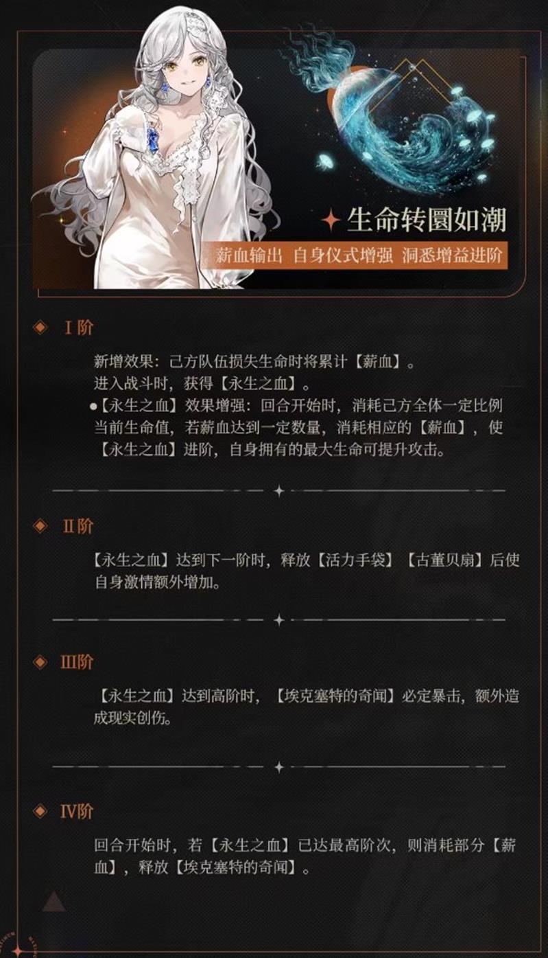 I阶:己方队伍损失生命时将累计【新血】,进入战斗时,获得【永生之血】。