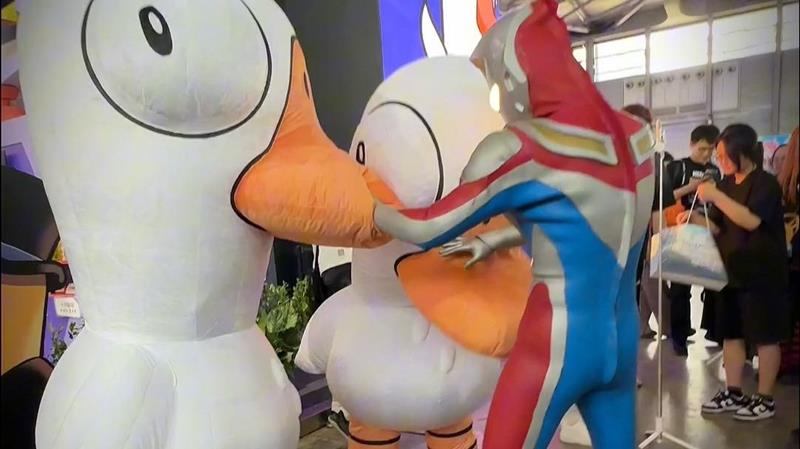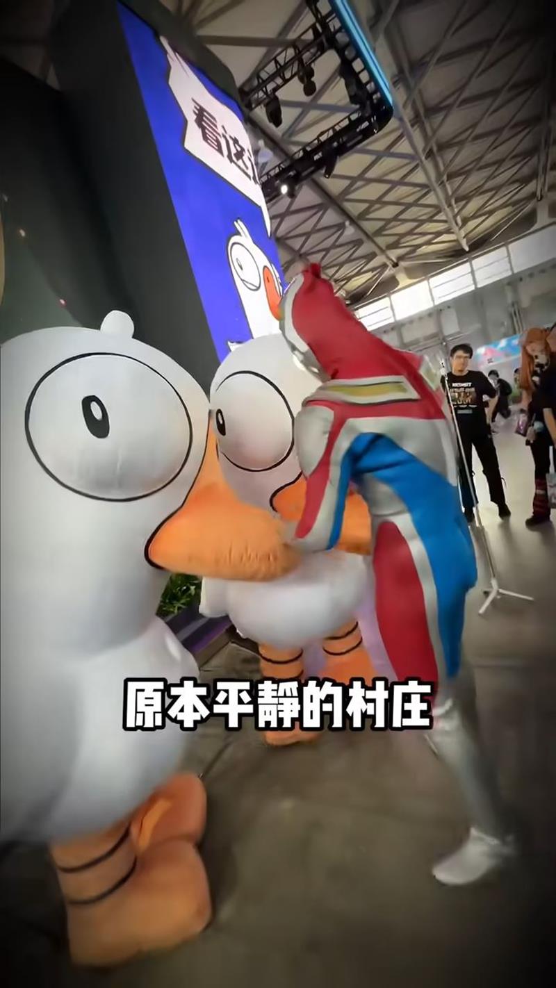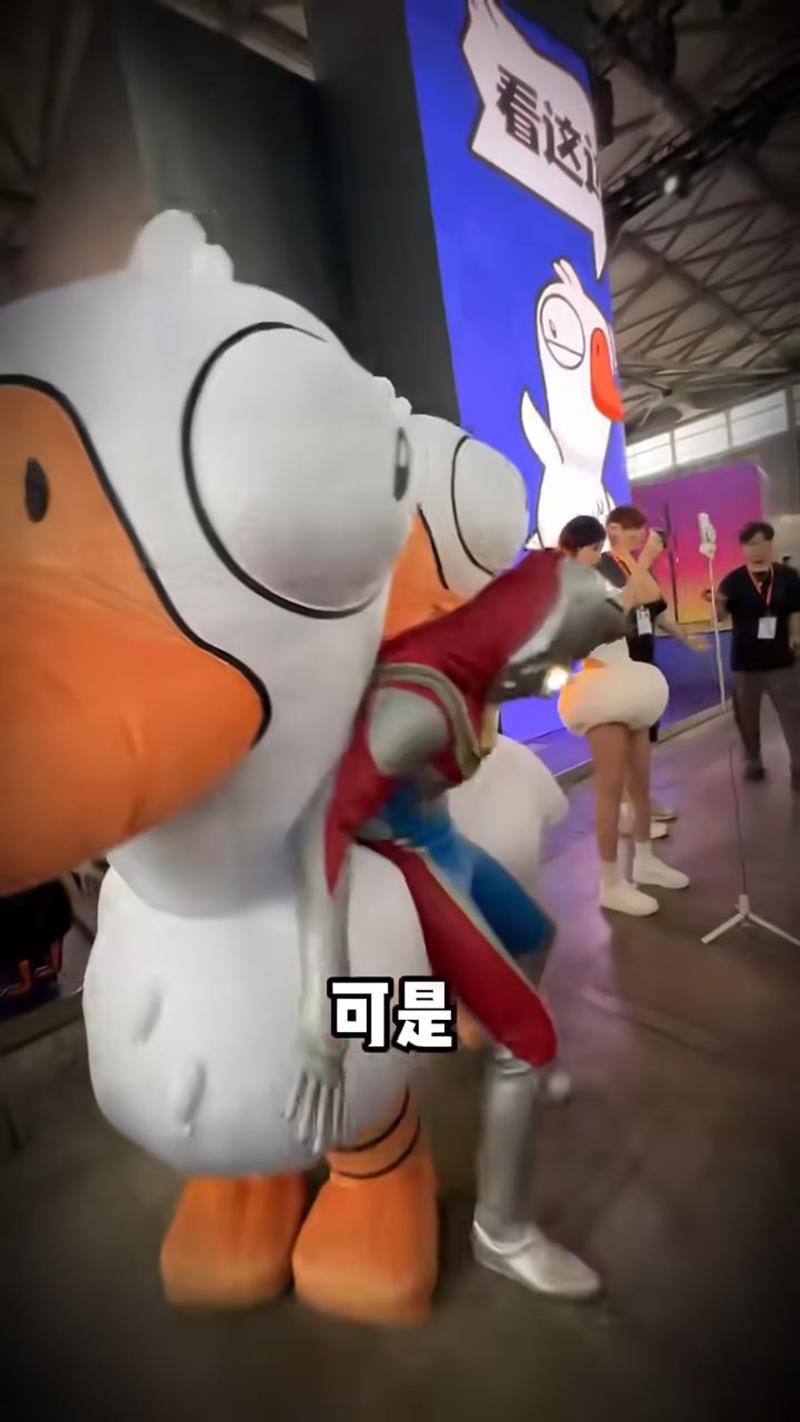 在展会上,人气角色“大白鹅”人偶惊喜现身,与玩家互动合影,还与奥特曼激烈交锋,成为全场最受欢迎的打卡点之一。
