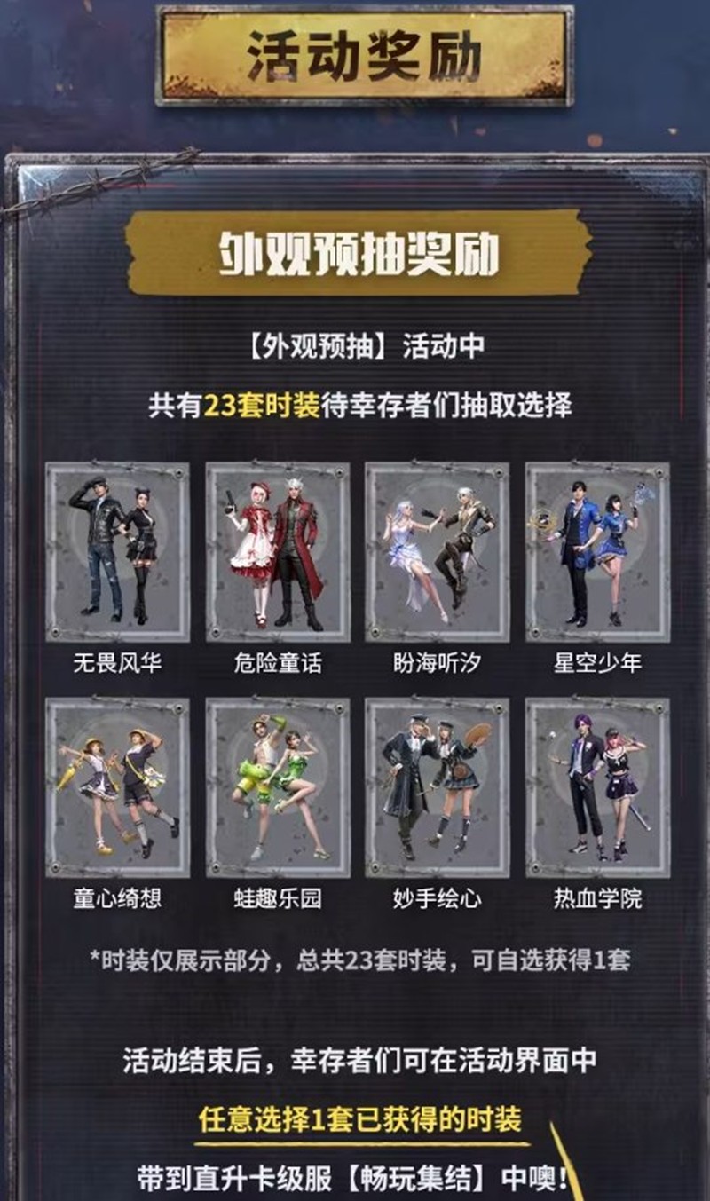 参与活动100%获得永久时装。共有23套时装供玩家选择,包括无畏风华、危险童话、盼海听汐、星空少年、童心绮想、蛙趣乐园、妙手绘心、热血学院等。