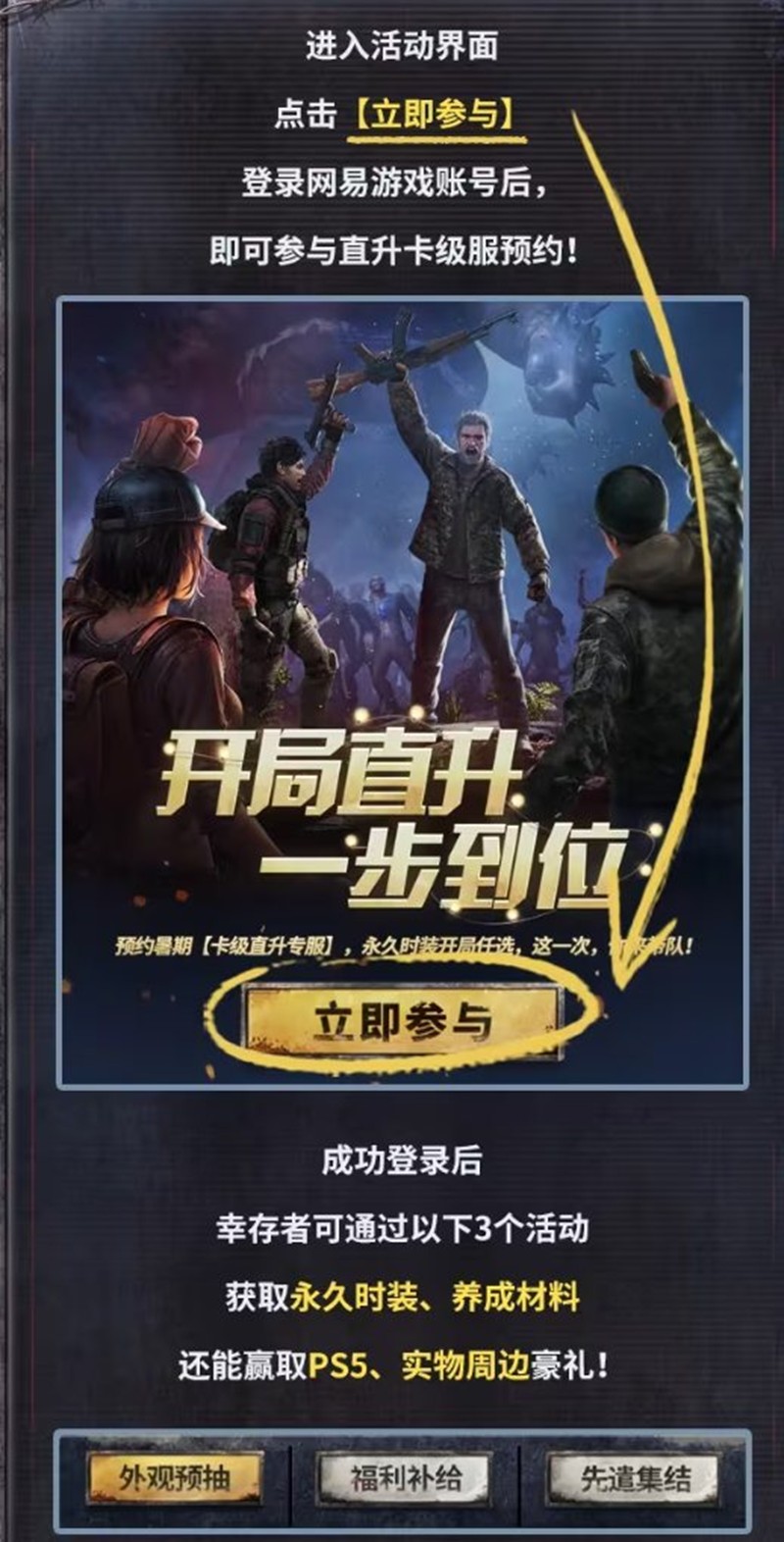 玩家们可以通过访问《明日之后》的官方网站,参与预约活动。成功预约后,玩家将有机会获得永久时装、养成材料等奖励,同时还有几率赢取PS5、严选卡等实物好礼。所有预约活动中的奖励,将在开服后直接领取至【畅玩集结服】的角色中。