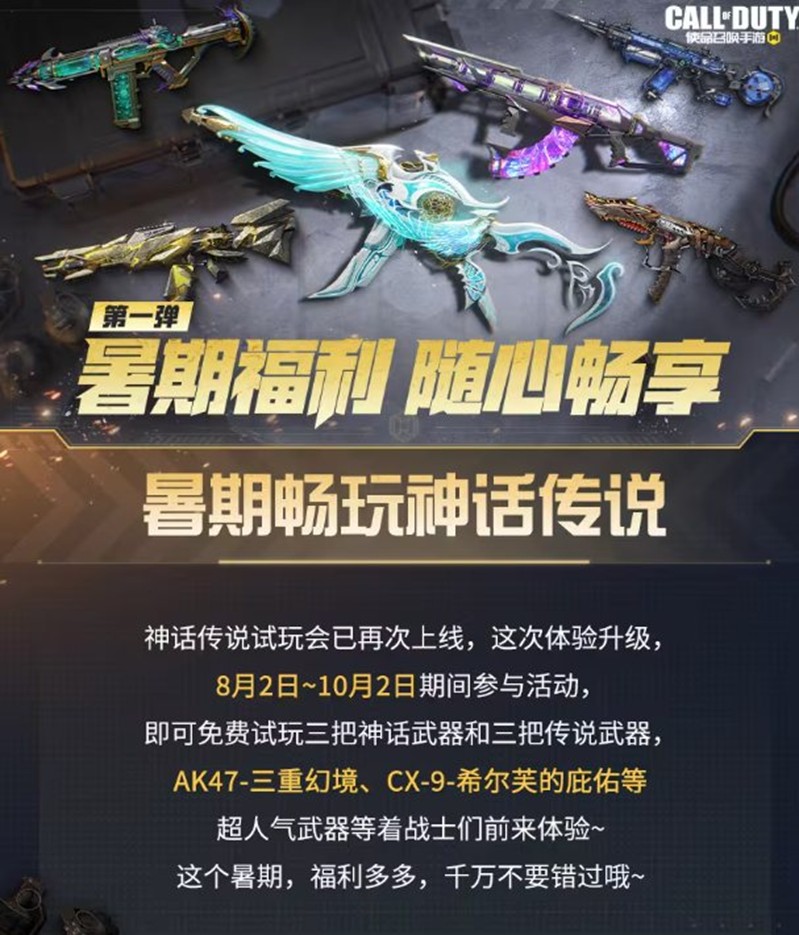使命召唤手游的这次新版本福利活动,无疑为玩家们的暑期生活增添了更多的乐趣。无论是免费试玩神话传说武器,还是参与开箱活动,都能让玩家们在游戏中获得更多的满足感。这个暑期,福利多多,千万不要错过哦!