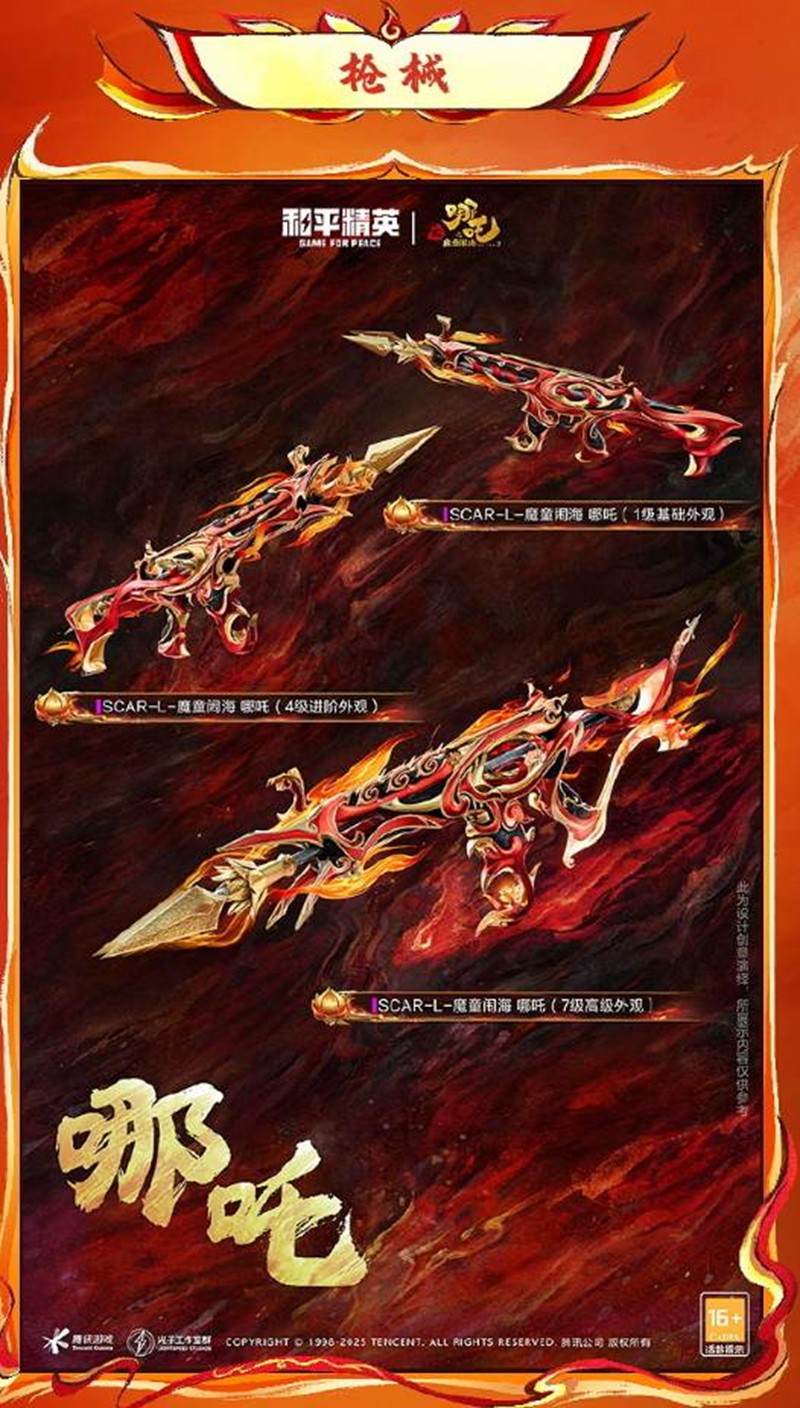 哪吒:SCAR-L-魔童闹海哪吒系列,枪身采用热烈张扬的红色,枪口设计为火尖枪尖,能量核心融入乾坤圈元素,随着枪械升级,火焰特效愈发强烈,仿佛随时将发起致命一击。