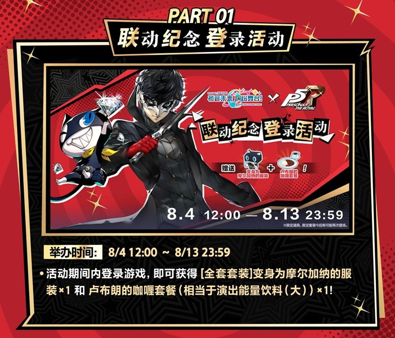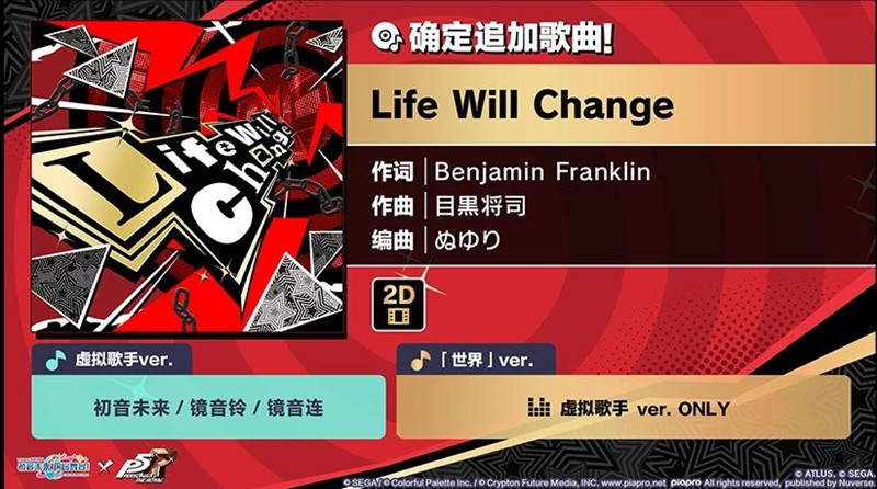 本次联动活动还为玩家带来了来自“Persona5”的经典乐曲——《Life Will Change》的虚拟歌手版将被追加进游戏中。