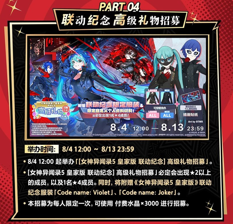 《初音未来:缤纷舞台》与《女神异闻录5皇家版》的联动活动一直是玩家关注的焦点,许多玩家都想知道这次联动活动到底有哪些精彩内容。切游小编整理了相关资料,本次联动活动内容丰富,包含限定招募、登录活动、集章活动以及乐曲追加等内容,接下来我们一起深入了解本次联动活动的具体内容。