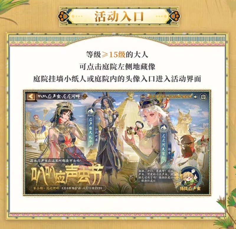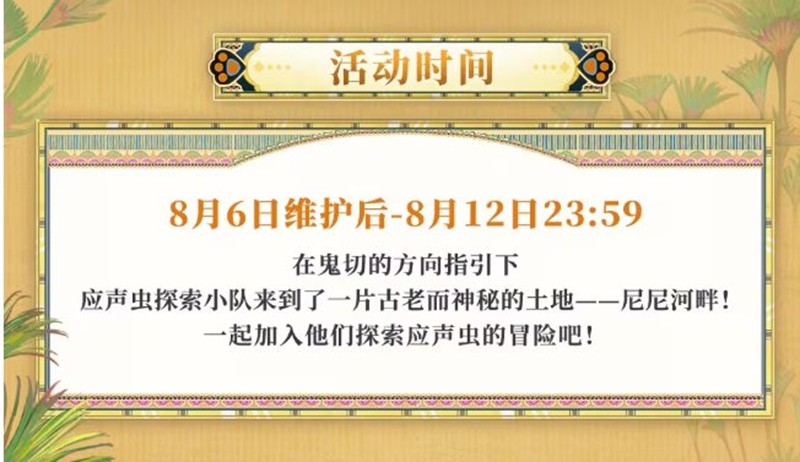 阴阳师手游即将推出全新的“应声虫节”活动,活动时间定于8月6日维护后至8月12日23:59。本次活动将带领玩家进入一个古老而神秘的土地——尼尼河畔,探索应声虫的奥秘。