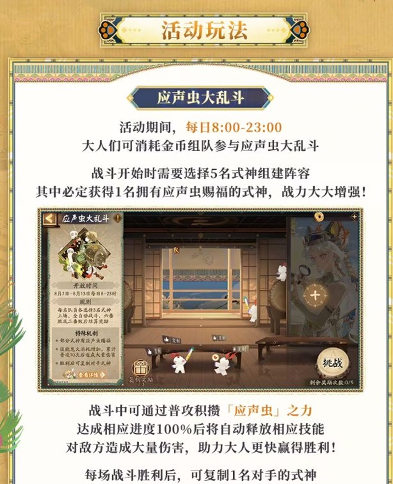 活动期间,每日8:00-23:00,玩家可以消耗金币组队参与应声虫大乱斗。战斗开始时,玩家需要选择5名式神组建阵容,其中必须包含1名拥有应声虫赐福的式神,以增强战斗力。