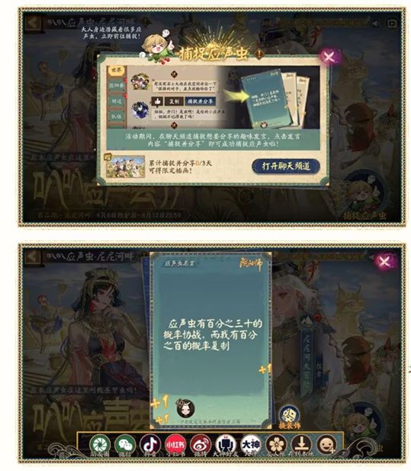 玩家可以通过点击“前往捕捉”按钮,自动打开“频道”,对其他玩家及自己所发布内容点击使用“应声虫分享”,生成一段趣味应声虫名片。每日分享1次应声虫名言名片,累计分享3次即可领取活动插画“悬沙溯金”。