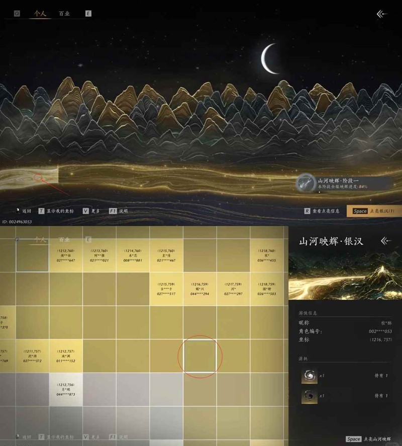 完成雄关镇兽和残卷绘忆获得奖励物品才能来点亮山河映辉选择河道中间区域放大再选择空白位置点亮(不要直接选点亮银汉,会引导到最新的进度位置,没有空位)