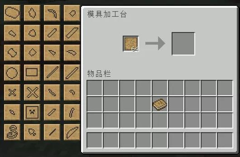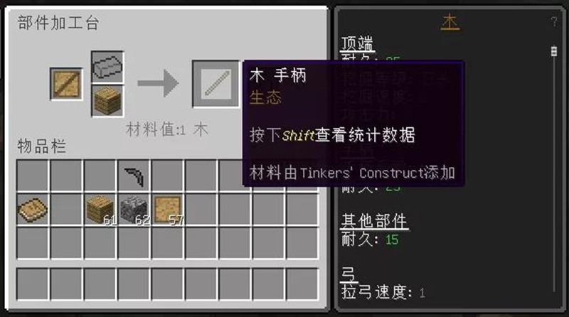 制作工具时,每种工具都由不同部件组成。以镐子为例,它需要镐头、手柄和绑定节三个部件。先在模具加工台制作对应的模具,然后在部件加工台使用模具和材料制作出实体部件。