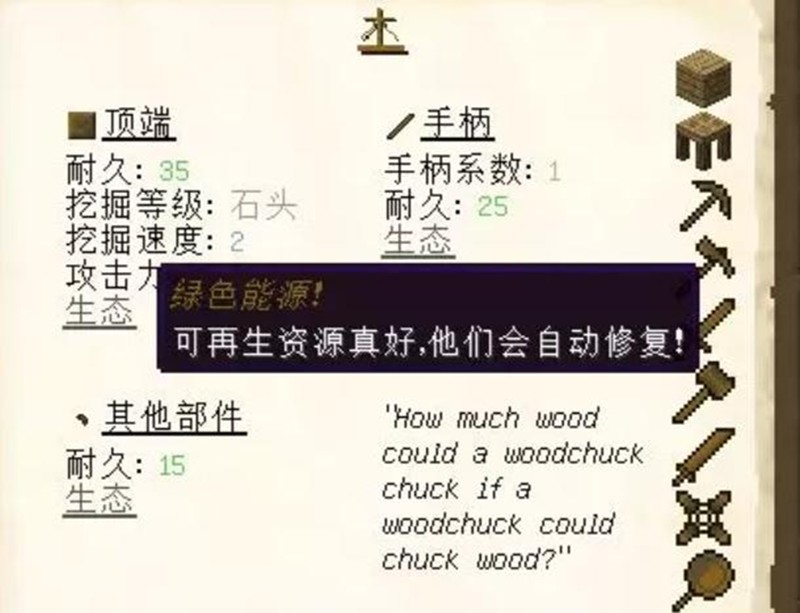 最后将这些部件放入工具装配台就能组合成完整的工具。不同材料制作的部件会赋予工具特殊属性,比如木质手柄能获得"生态"效果,可以自动恢复耐久度。