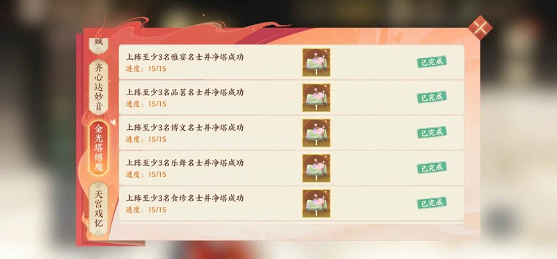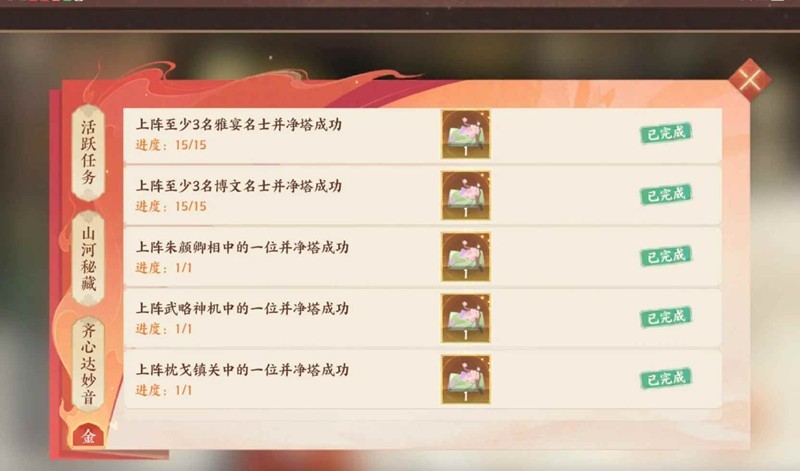 小技巧是有的任务可以一起做掉。一个名士有两个标签,稍微算计一下可以两个一起完成(我记得我是一起做的品茗弈棋还是食珍我忘了,反正实测可行