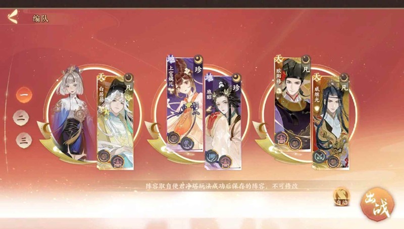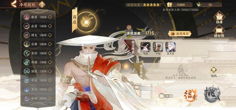 十一二层以后,天卡掉率高了,草也攒了几十根,可以刷“三名xx名士”,不用一口气全刷出来,一层刷几次如果一直不出也别死磕后面还有机会,前面用不到的淘汰下来的卡可以卖掉,留几根防止失败了刷新对面配置用。上阵四字组合名士之一那个如果碰到了就买,没碰到等打完14再刷不迟,只要上一个就行比三个的简单(但是也不一定好刷,我最后一个蒙恬白起组快刷空了才刷到)。