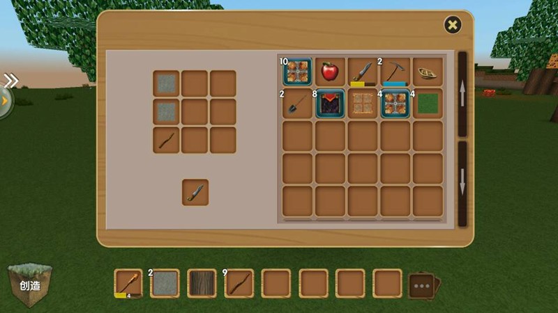 以基础短剑为例,合成需要两个石头和一个木棍。在创造模式中,这些材料可以直接从方块界面获取,也可以通过工具获得铁镐后采集石头。