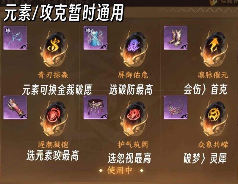 优先3金3火1木,不走3木,词条占比可按主词条收益面板,主词条优先原则,逢虚+破霄+汲川+昆吾为必上,元素尽量上融甲内功,攻克则不上,进战模糊,逢虚特性无法下场