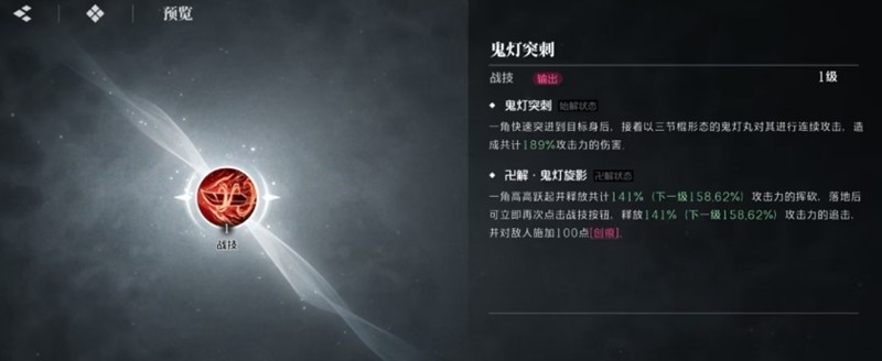 战技鬼灯突刺展现了斑目一角的速度优势。这个技能让他能够快速突进到目标身后进行连续攻击。在万解状态下,该技能还能追加一次强力追击,并叠加创痕效果。创痕效果最多可叠加20层,每层都能让敌人受到额外伤害,持续10秒的时间为玩家提供了充分的输出窗口。