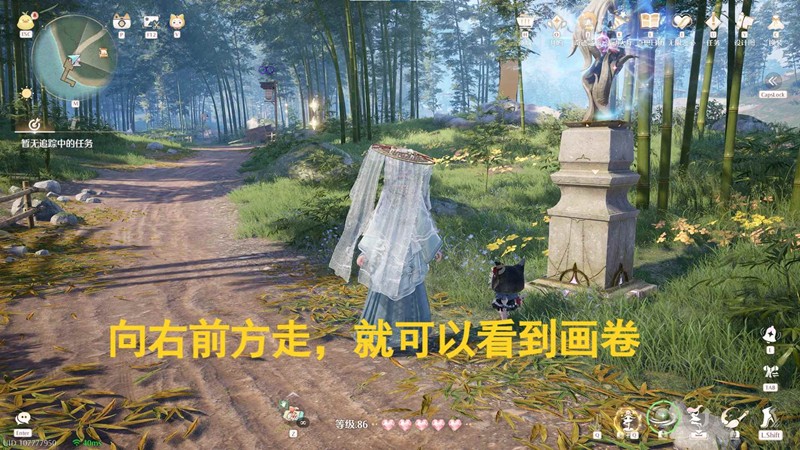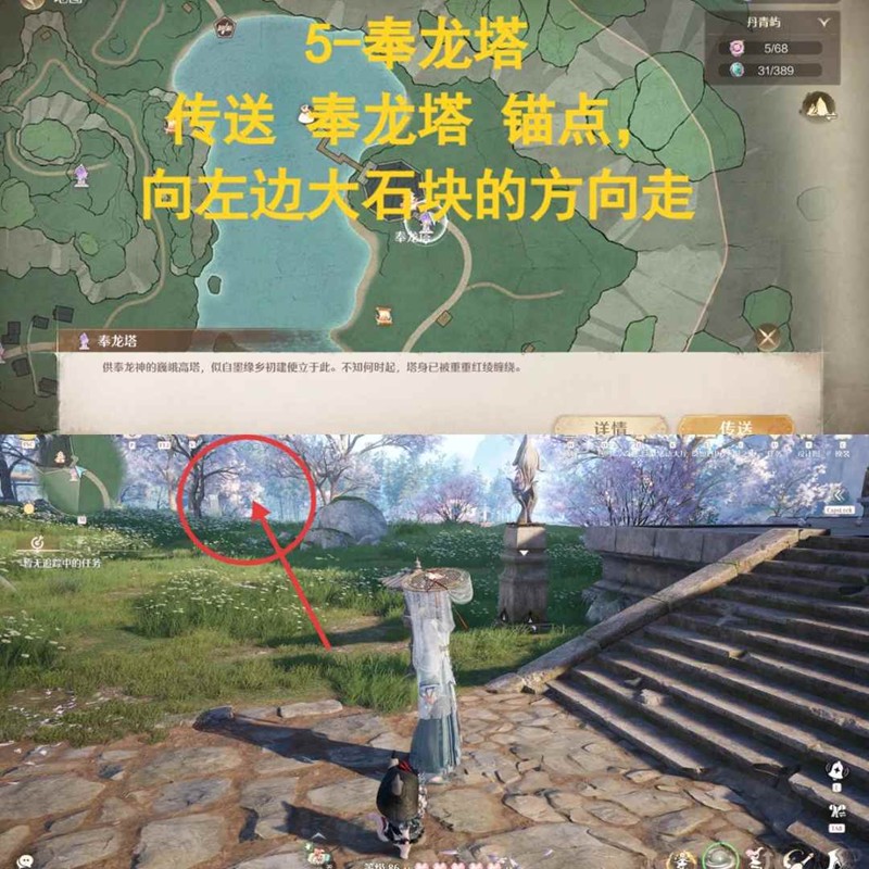 我们传递到 奉龙塔 锚点,然后向左边的大石块方向走,可以看到画卷,我们用丹青能力打开后,可入画解锁;