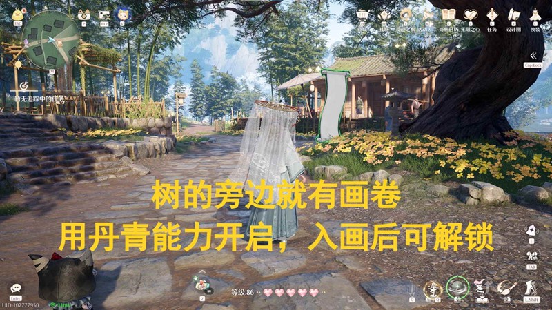 我们传送到 墨缘坊市 锚点,再转身向后面的楼梯上去,在树的附近就有一个画卷,我们用丹青能力打开后,可入画解锁;