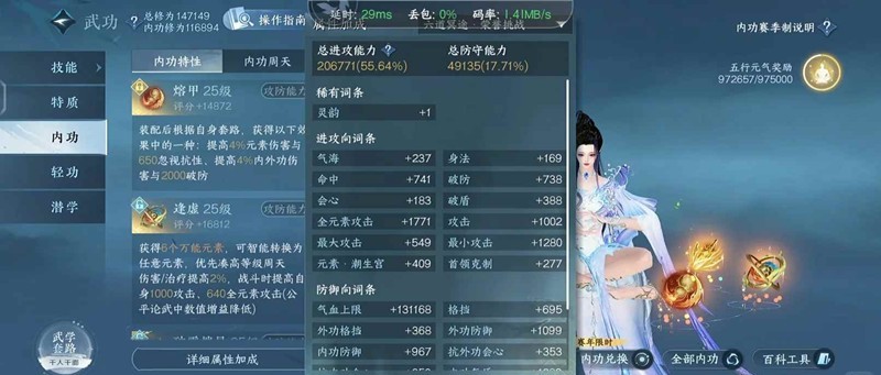 内功词条选择:全元素攻,潮生宫元素,气海,身法,命中,会心,攻击,首领克制,大小攻,破防在元素流收益最低