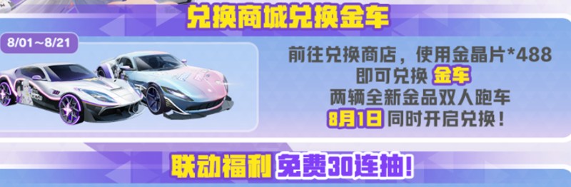 联动期间,玩家登录游戏即可获得30次免费抽奖机会,还有专属金色动作作为额外奖励。游戏内特别推出了两辆金色品质的双人跑车,玩家可以使用488个金晶片进行兑换。这些跑车不仅外观炫酷,性能也十分出色,是战场上的绝佳载具。