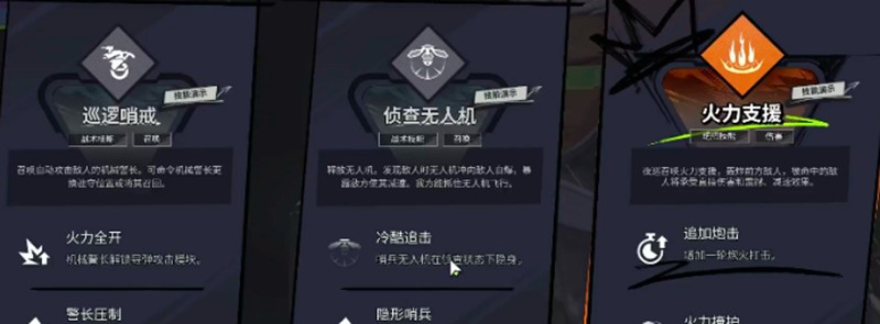 第三个技能火力支援是范围轰炸技能,释放4秒后会在指定区域进行多波轰炸。1级轰炸4波,2级5波,3级提升无人机伤害并增加护盾。这个技能推进速度会随等级提升而加快,但容易被敌人逃脱,实战中更适合作为步枪使用。