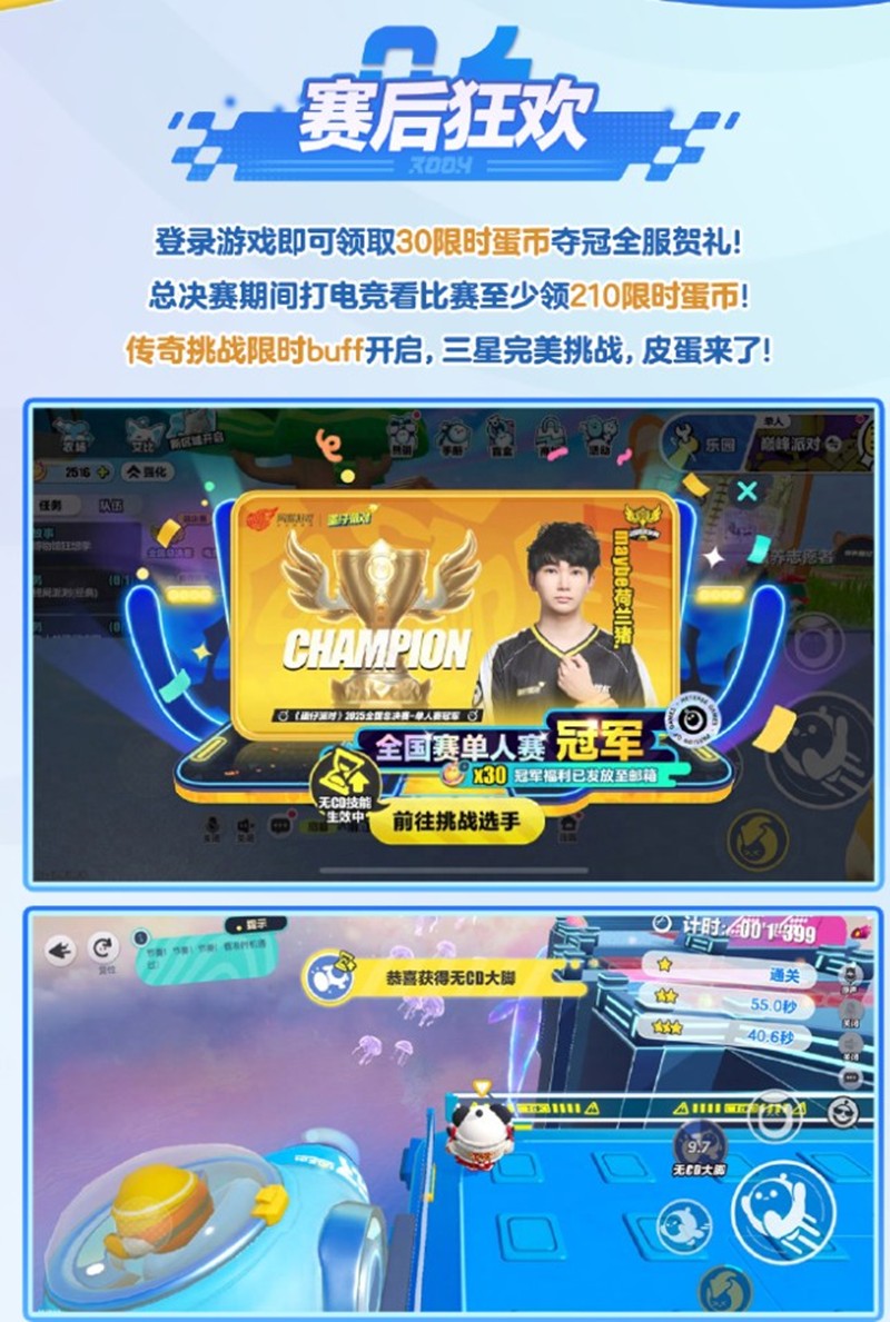 为了庆祝本次全国总决赛的圆满成功,游戏内特别推出了一系列庆祝活动。登录游戏即可领取30限时蛋币夺冠全服贺礼,总决赛期间打电竞看比赛至少领210限时蛋币。