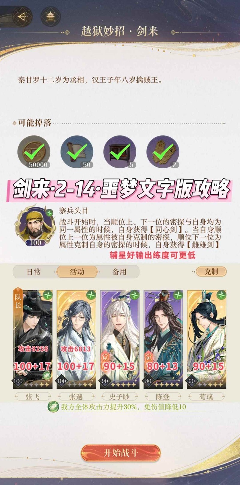 以上就是如鸢剑剑剑来第二章攻略,2-14噩梦文字版攻略的全部内容了,更多游戏资讯,攻略内容敬请关注切游网,您的支持是我们努力的动力!