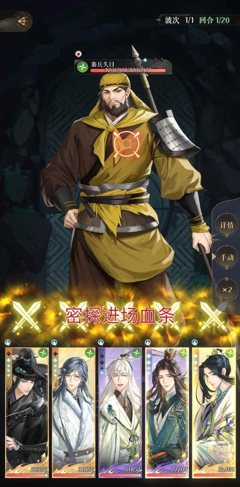 2. 该配队站位打法19回合必须打死boss,20回合我方张邈和陈登身上会失去【剑痕】,就算打死boss了也会劝退我方全体密探失败