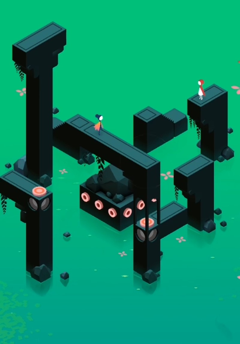 当中间建筑升起后,旋转整体建筑两次,使萝尔能够触碰到粉色按钮,同时女儿也会按下另一个按钮触发场景变化。